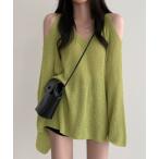 ニット セーター オープンショルダーVネック透かし編みニットトップス レディース