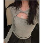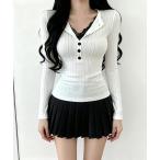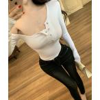 tシャツ オフショルダーフロントボタン長袖リブカットソー レディース