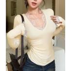 tシャツ レース付きVネック長袖リブトップス レディース