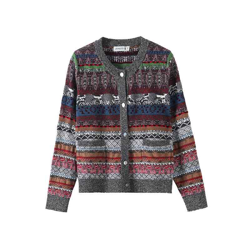 カーディガン ニット 秋 レディース 羊毛 レトロ エスニック ジャカード セーター ジャケット クルーネック 長袖 30代 おしゃれ ポケット 暖かい 白黒