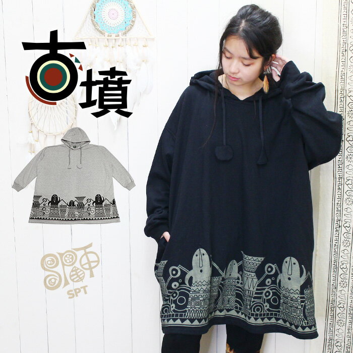 大きいサイズ トレーナー レディース メンズ ユニセックス SPT 壁画風はにわプリント 裏起毛ビッグ&ロングパーカー 【メール便不可】《エスニック アジアン ファッション 裏起毛 ロング トレーナー エスニック アウター 長袖 ladies ethnic parker》