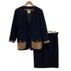 良品 HERMES エルメス レザーインサート ノーカラージャケット スカート セットアップ 42 ネイビー レディース 古着 中古