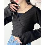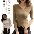 カシュクールニットトップス ニット トップス ニットカットソー ニットソー レディース 長袖 リブニット リブ カシュクール セーター 無地 シンプル