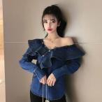 デニムフリルシャツ カットソー カシュクール スリット デニム ダンガリー フリル Vネック タンガリー デニムフリル 長袖 トップス シンプル 大人 オフィス