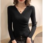 ニット カットソー Vネック リブニット トップス カシュクール ニットセーター ラップデザイン 長袖 無地