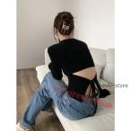 バックリボンタイトトップス背中あきカットソーTシャツレディース長袖カシュクールタイトフィットトップスインナー着痩せ春秋