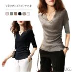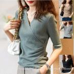 サマーニット レディース トップス 半袖 Vネック リブ Tシャツ 五分袖 スリム タイト カシュクール カットソー おしゃれ 着痩せ 無地 春夏 秋