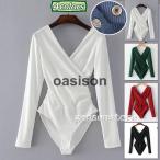 カシュクール Vネック トップス レディース Tシャツ 長袖 クロスデザイン インナー カットソー 無地 レオタード トップス つなぎ ボディシャツ スリム 肌着