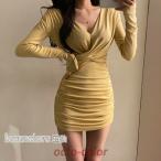 カシュクール カットソーワンピース ミニ丈 秋物 Vネック ギャザー 長袖 タイトワンピース レディース 無地 体型カバー インナー オフィス エレガント きれいめ