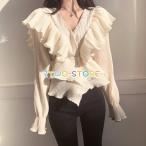 レディース ブラウス カットソー Vネック 長袖 フリル カシュクールデザイン レース 無地 甘めコーデ スタイルアップ効果 フェミニン S-2XL