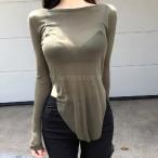 レディース 長袖 Tシャツ 丸襟 無地 スリム スリット入り カットソー シンプル カシュクールTシャツ 透け感 美しい 超薄手 セクシー トップス 春秋新作