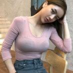 韓国風 シンプル トップス レディース 無地 長袖 tシャツ ラウンドネック カットソー 薄手 透け感 スリム カシュクール ロンTシャツ カジュアル 通勤