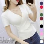 Vネック胸開き カシュクールTシャツ 半袖 夏 カットソー スリム 無地 へそ出し レディースファッション Vネック ベアトップ 韓国風 胸元 解禁シャツ