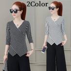 カットソー レディース トップス 長袖 プルオーバー Vネック ボーダー カシュクール風 おしゃれ きれいめ バイカラー シック 大人可愛い オフィス