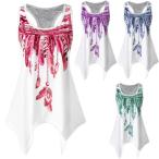 タンクトップ カットソー ノースリーブ トップス レディース マッチョタイプ レース切り替え フェザー柄 羽模様 チュニック丈 ラウンドネック 丸襟