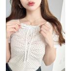 tシャツ フロントギャザーヘンリーネックピコレースリブカットソートップス レディース
