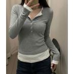 tシャツ ダブルヘンリーネック レイヤード風 配色ロンT レディース