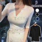 トップス カットソー tシャツ ヘンリーネック Vネック 7分袖 セクシー 透け感 タイト シャツ レディース シンプル 無地 インナー ストレッチ20代 30代40代