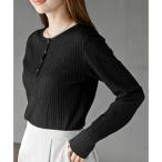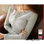 tシャツ 「人気新色登場入荷済!今すぐチェック!」韓国風リブカットソー 長袖トップス/ヘンリーネック&ボタンデザイン レディース