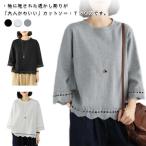 カットソー 大人可愛い 清楚 透け感 カットソー クルーネック トップス 透かし彫り レトロ 七分袖 シャツ ロング ブラウス 白 綿 上品 コットン