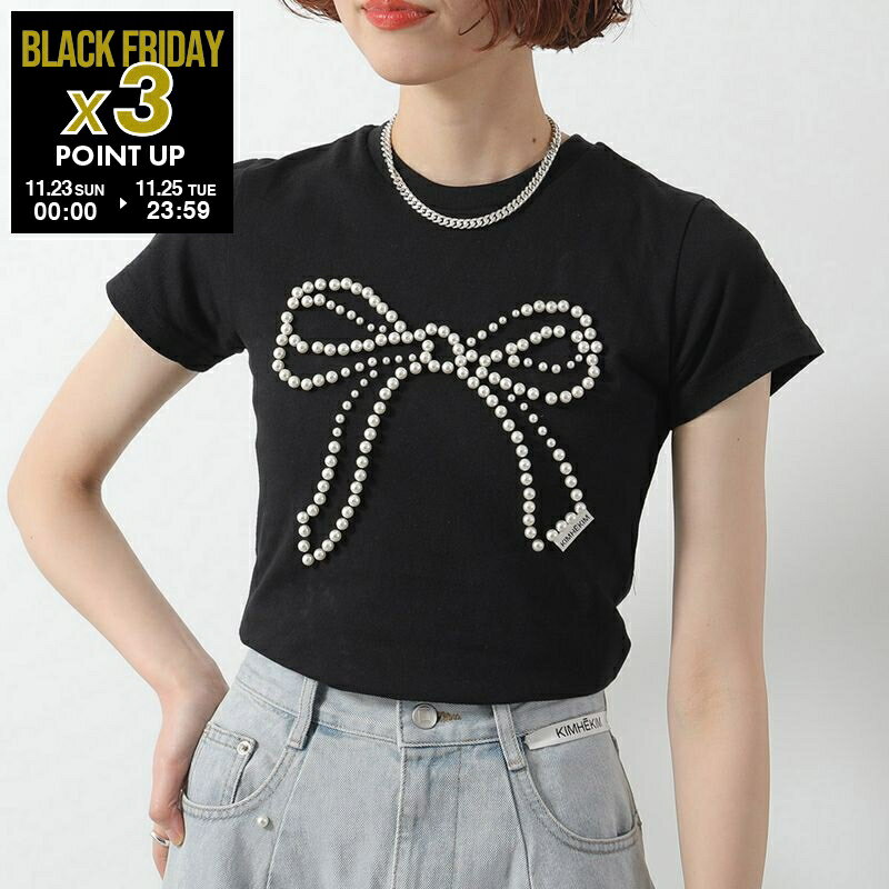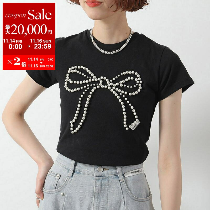 KIMHEKIM キムヘキム Tシャツ PS25-JS07 レディース 半袖 カットソー コットン クルーネック パール装飾 リボン ロゴ BK/BLACK