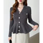 tシャツ くびれシルエット ペプラムトップス ニット カーディン ペプラム パールボタン付き Vネック スキッパー 長袖 レディース