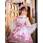 和風ロリータ衣装ロリータドレスポリエステル弓花柄キモノノースリーブピンク
