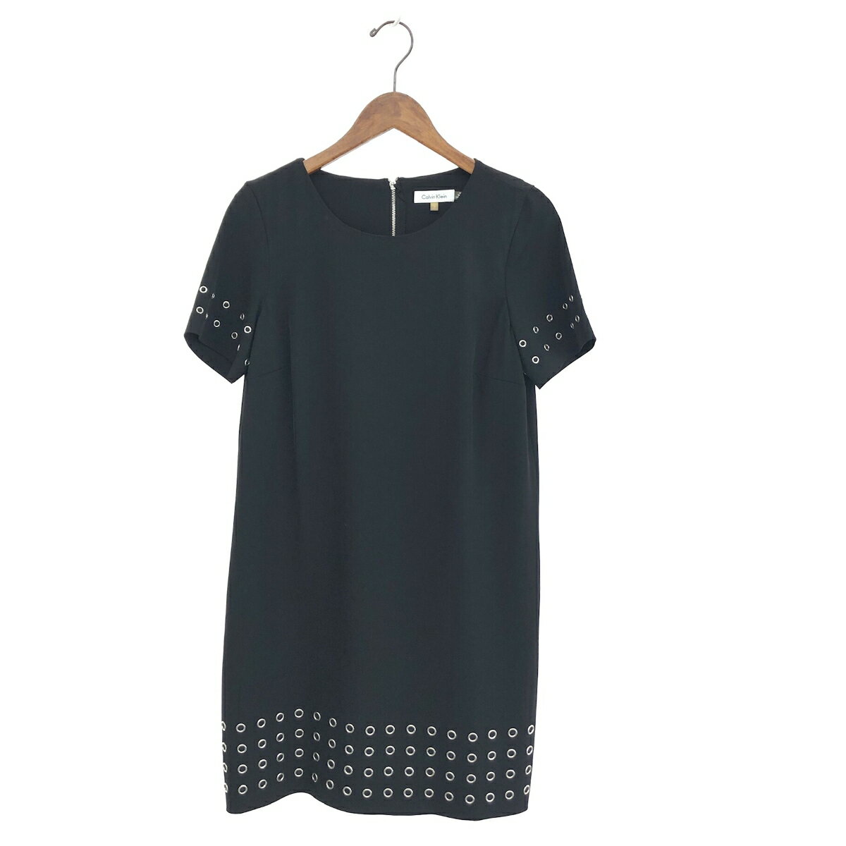未使用品 カルバンクライン CALVIN KLEIN ワンピース ひざ丈 ノッチネック 半袖 ジャージー素材 ストレッチ 2 S 黒 ブラック