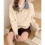 カーディガン デニム襟がアクセントのジップアップリブニット レディース