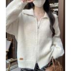 カーディガン 襟付きジップアップシャギーニットカーディガン レディース