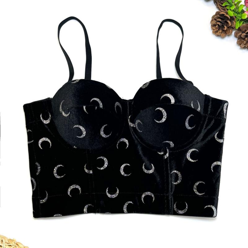 ビスチェ レディース ブラック ベロア プリント 高級感 デザイン セクシー フィッシュボーン カップ付き 欧米風 キャミソール ポリエステル スリムフィット ショート丈 伸縮性 春夏(x200)