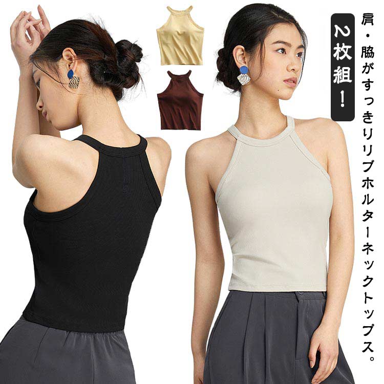 カップ付き タンクトップ レディース トップス 2枚組 ブラカップ ホルターネック ブラトップ キャミソール カジュアル リブ生地 インナー 無地 レイヤード 重ね着 お洒落 スポーツ 春夏 ストレッチ性 送料無料