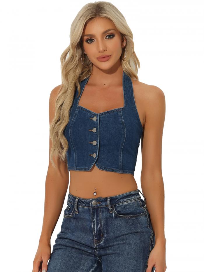 【期間限定10%OFF】Allegra K デニム クロップトップ ノースリーブ ボタン フロント ホルター タンクトップ レディース ダークブルーM
