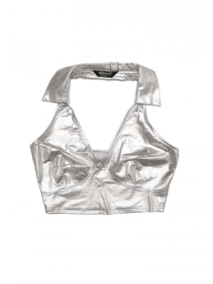 【期間限定10%OFF】Allegra K クロップトップ メタリック タンクトップ 光沢 パーティー ホルター ホログラフィック レディース シルバー2M