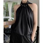 キャミソール ビジュー付きアシンメトリーホルターネックトップス