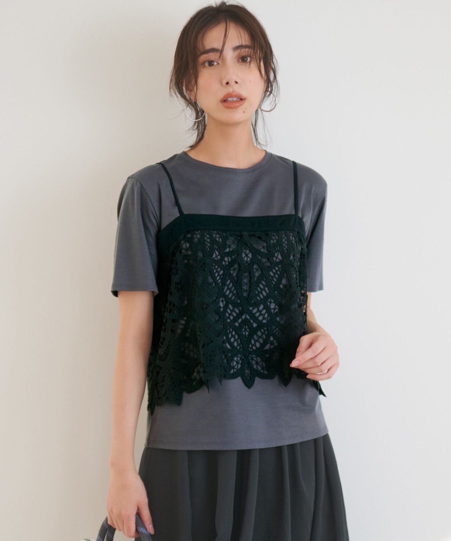 23区(ニジュウサンク)/【好評につき新色追加/汗じみ防止】エンブロイダリージャージー レースキャミソール付き カットソー