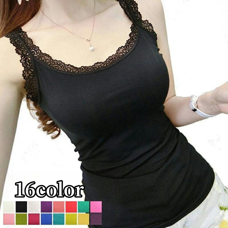 送料無料 キャミソール ノースリーブ レディース 女性 インナーウェア 肌着 無地 単色 Uネック レース おしゃれ かわいい リブ素材 シンプル カジュアル ガーリー 大人 上品 黒 白 春 夏 秋 冬