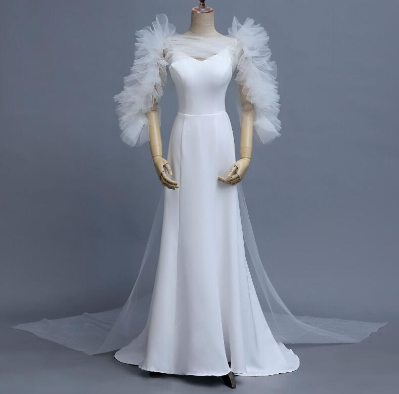 実例写真!2ways キャミソールウエディングドレス シンプル パール マーメイド ケープ風ソフトチュールボレロ