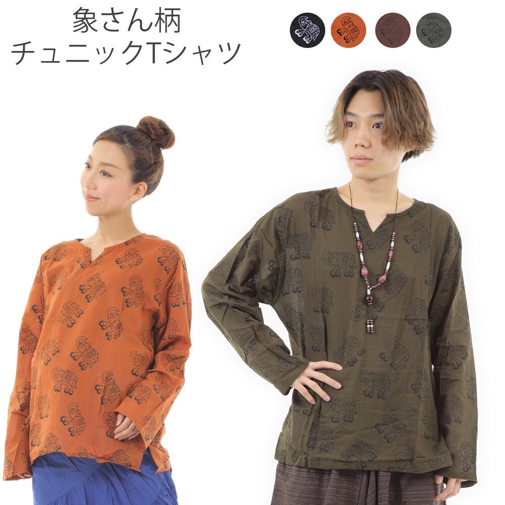 オリエンタル柄 長袖Tシャツ チュニック メンズ レディース カットソー 大きいサイズ ロンT プルオーバー ロンティ エスニック アジアンファッション オーバーサイズ 涼しい ゆったり クルタ フリーサイズ エレファント 送料無料 a