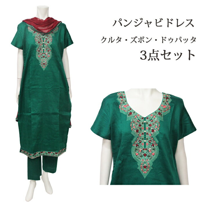 <M〜L>パンジャビドレス:クルタ・ズボン グリーン / インド衣装 民族衣装 アジアンファッション パンジャビ ドレス カミーズ エスニック