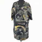 シーバイクロエ★絹/シルク100%ワンピース【サイズ38/M/黒系】手書きイラスト風プリント/鳥/風景/Vネック/半袖◆BA626L