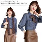 デニムシャツ レディース デニム スリム ブラウス ウェスタンシャツ ボウタイ リボン付き 長袖 チュニック 綿 コットン トップス シャツ 羽織