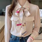 ブラウス レディース 女性用 蝶ネクタイ レース プリント柄 シフォン ロングスリーブ ニッチ シルク ウェスタン ポロ襟 シャツ袖 ポリエステル
