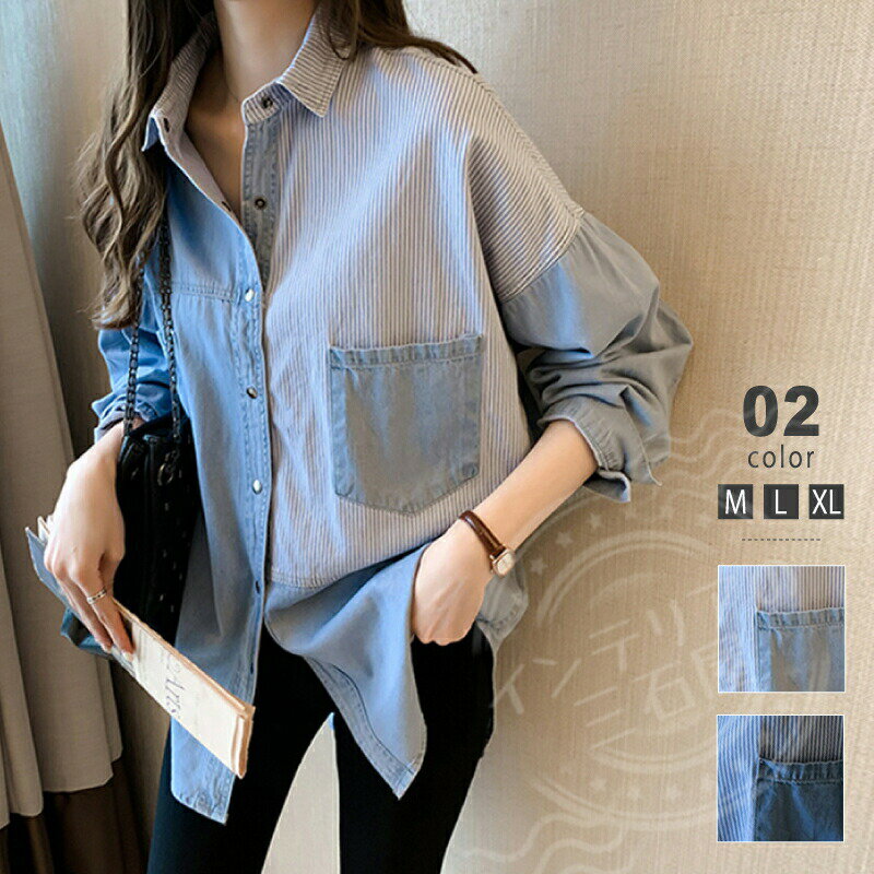 【3点15%offクーポン配布中! デニムシャツ レディース パッチワークシャツ ウエスタンシャツ デニム シャツ トップス 長袖 ロング タンガリー シャンブレー 切替え ストライプ ゆったり 大きいサイズ 春 夏 秋 秋色 韓国ファッション 20代 30代 40代 50代