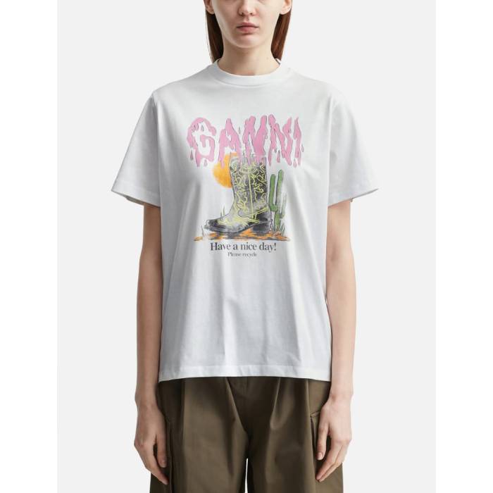 ガニー Ganni 【 Western Boot Print T-Shirt Women Bright White 】 ウェスタン ブーツ Tシャツ レディース 白色 ホワイト