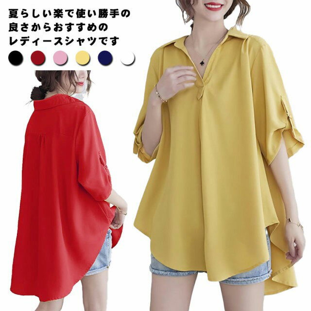 お尻隠し オーバーサイズ シフォンシャツ シャツ スキッパー トップス タック入り Aライン Vネック 5分袖 レディース 春 体型カバー 秋 ロールアップ シフォンシャツ お洒落 落ち感