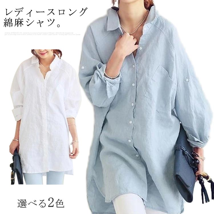 ブラウス レディース ロング丈 綿麻シャツ シャツ 長袖 とろみシャツ 森ガール系 ビッグシルエット 無地 チュニック ナチュラル シャツ ロールアップ袖 大きいサイズ 春 夏 リネンシャツ