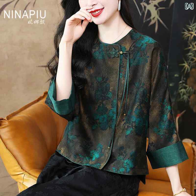 シャツ レディース ネオチャイナ 中国風 香雲紗 マルベリー 花柄 箔押し ブルー レトロ エレガント 上品 ラウンドネック 七分袖 春