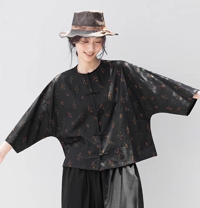 レディース トップス シャツ 七分袖 チャイナ風 薄手 黒 鳥 空飛 オレンジ 刺繍 中華ボタン プレートバックル シングルブレスト 幅広脇 ワイド袖 ゆったり 綿 ワードロープ エレガント 軽量 快適