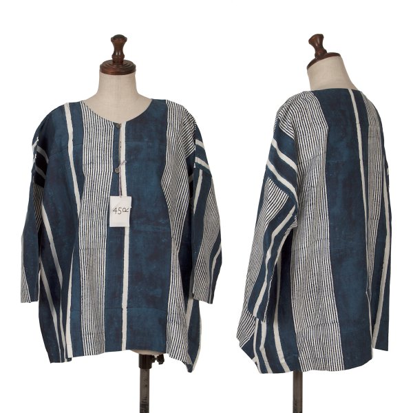 45rpm 45R シルク混コットンマルチストライプ七分袖プルオーバーノーカラーシャツ 青白【レディース】